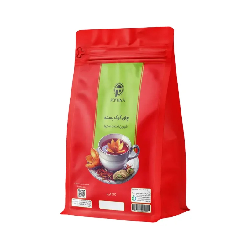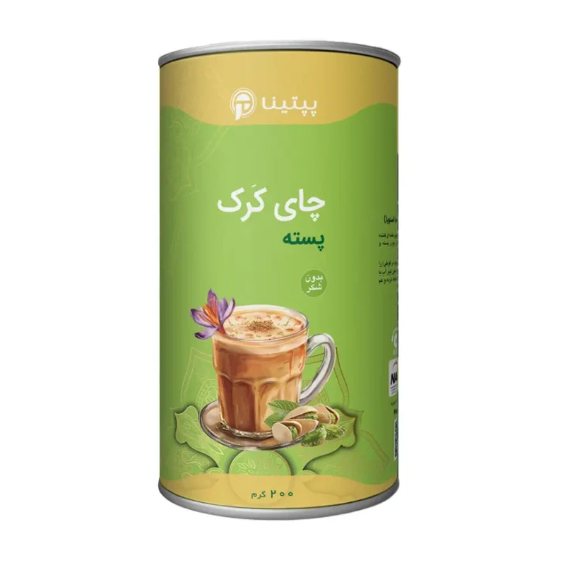 کرک پسته زعفرانی ترکیبی از : پودر چای سیاه فوری، پودر خامهای کننده غیرلبنی (برپایه روغن نارگیل)، پودر سرگل زعفران، پودر پسته زعفرانی و استویا (عامل شیرین کننده)